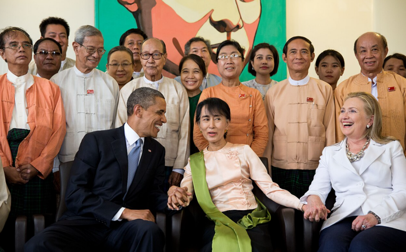 2012年11月,昂山素季在其家中接待到访的奥巴马和希拉里。缅甸当时被美国宣传为“转型样板”。